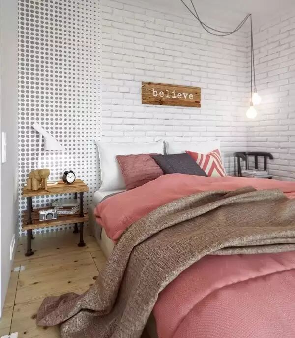 该平台带来了额外的存储空间,因为房间里的衣柜里是很小的。砖墙上的现代钉子提供了额外的悬挂空间。