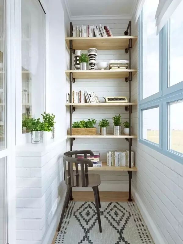 走廊的另一边是一个小型图书馆和铁皮温室,为客户配备一个椅子,看看窗外,窗户天蓝色镶边也会让人心情舒适。