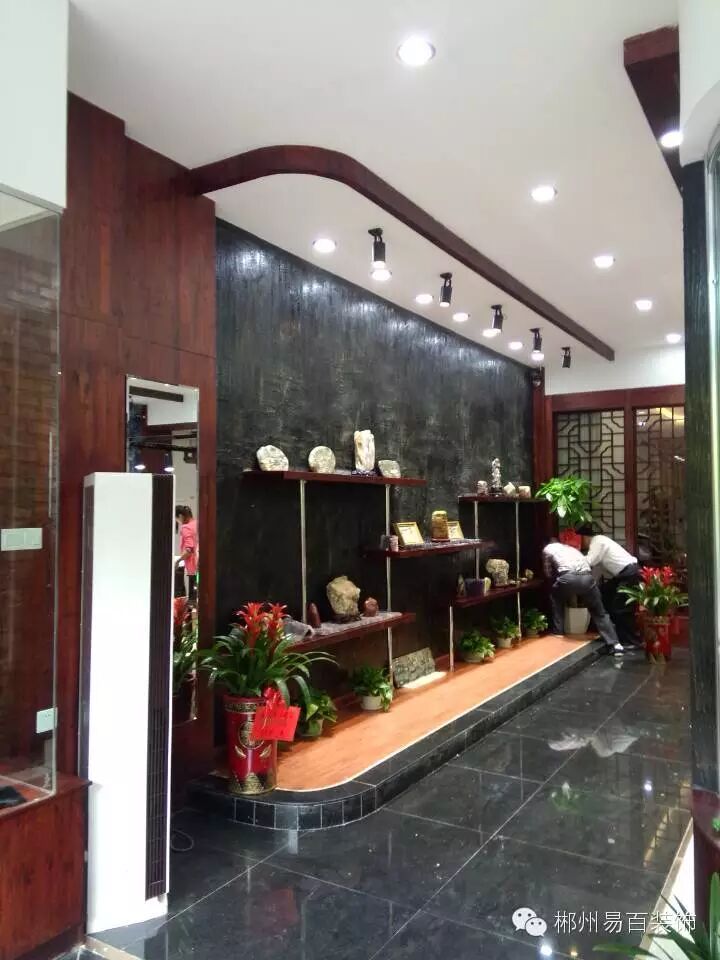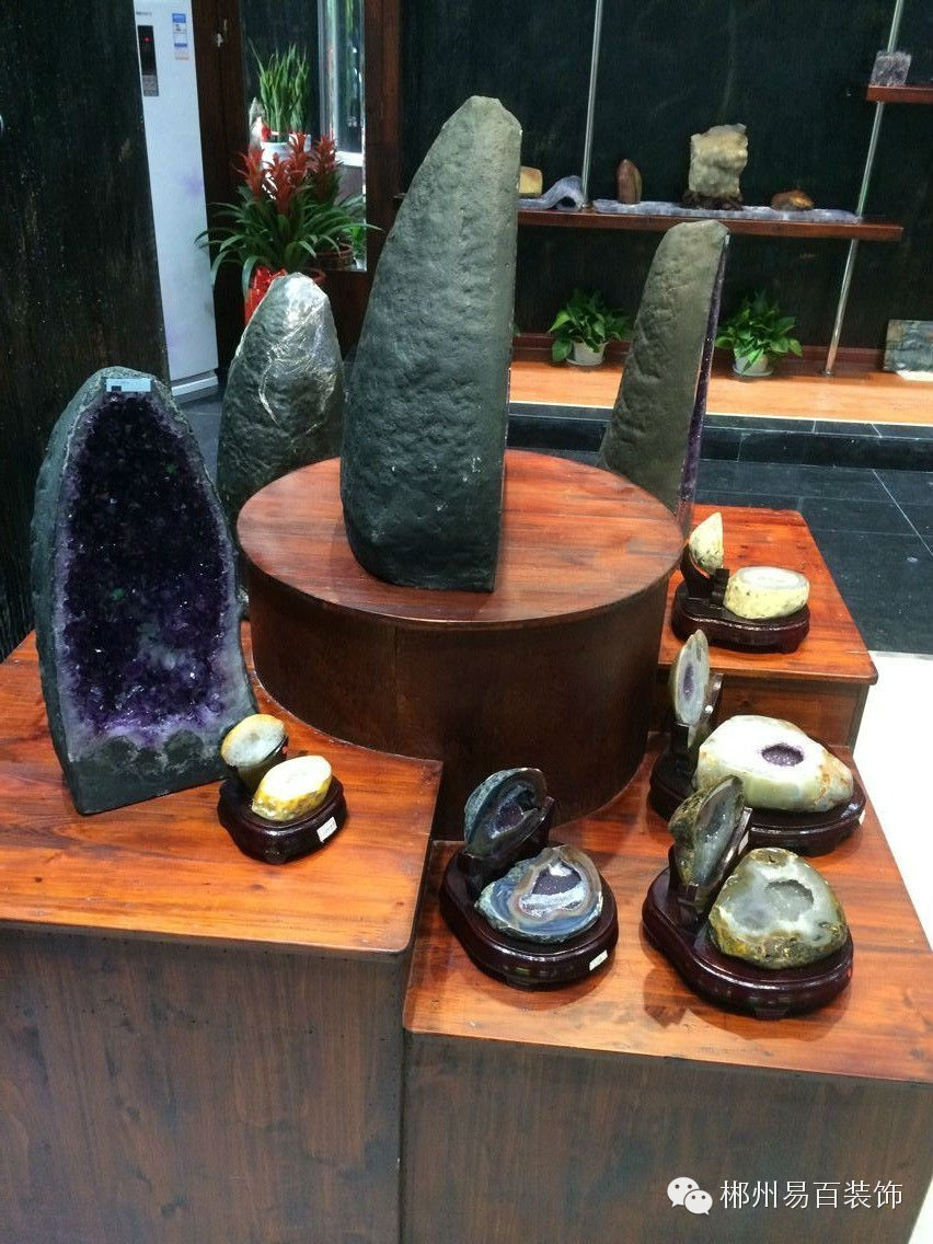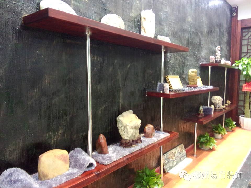 左边承板展架的背面采用真石漆涂抹,再经过灯光的照射,衬托出展示架上奇石的清透、明亮。