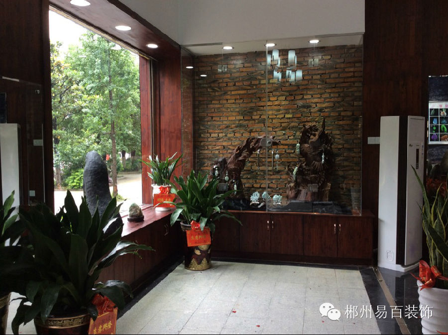 进门左侧的墙面未作太多的装饰,红砖用清漆处理展现一种原始朴素的风味,展柜的装饰又用根雕的自然美来呼应玉石的光泽与灵性。