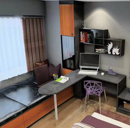 飘窗和书桌的位置成直角,因此正好从书桌延伸出一个直角吧台。如此一来,办公区有了休闲地,而飘窗休闲区更填一份慵懒惬意。(点击申请免费设计飘窗)