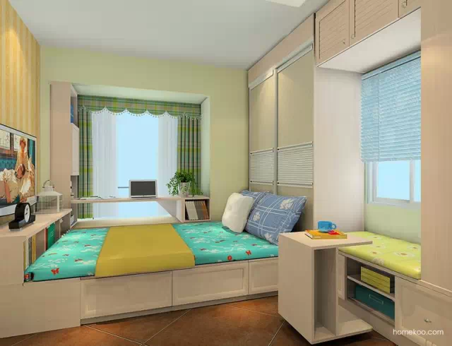 一大一小两个飘窗,太好了。大飘窗打造成书柜加书桌的组合,坐在榻榻米床上,连椅子都省了。小飘窗处设计一个可移动茶几打造成休闲区,棒呆!