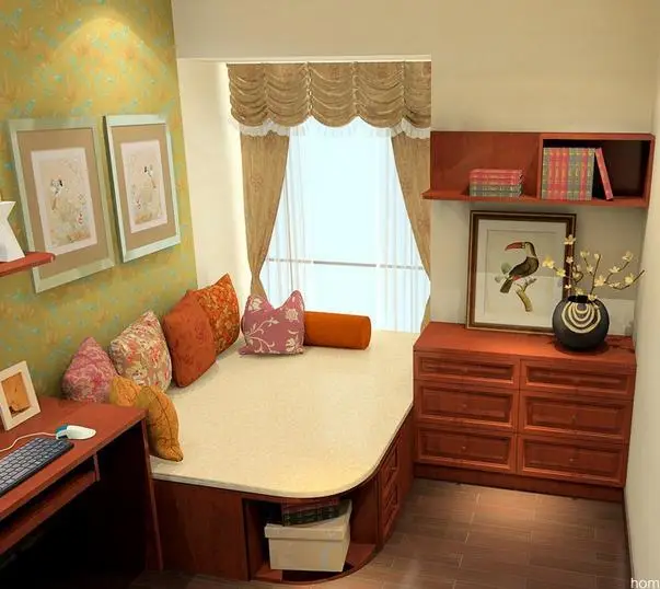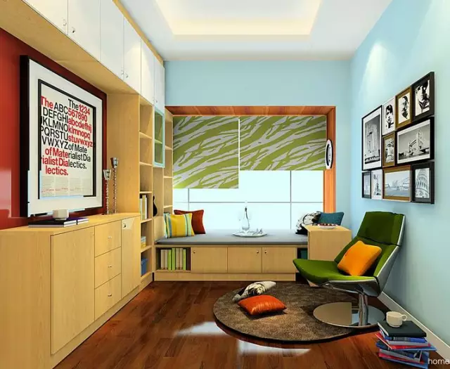 依着飘窗摆放一个宽大舒服的座椅,铺上地毯,慢慢度过那份休闲轻松的阅读时光。看书累了,坐上飘窗喝杯茶,远眺一下外面的风景,真是太享受了!