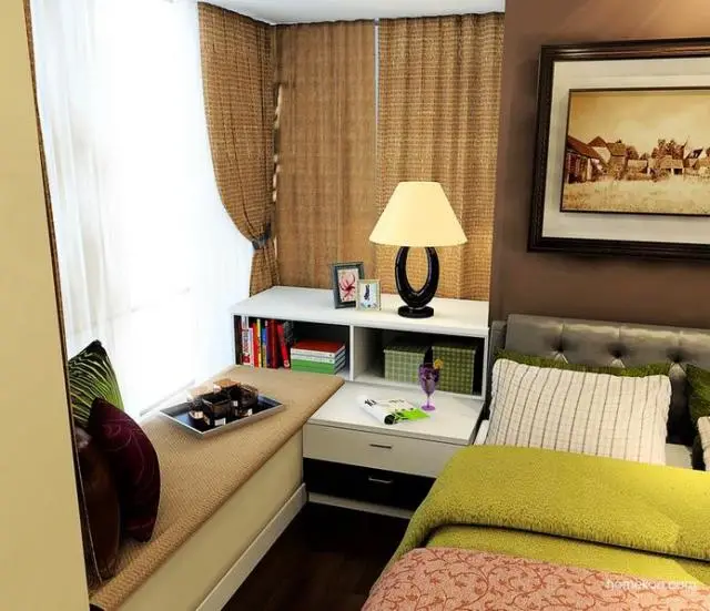 凹位加飘窗,也能成为一种布置私密休闲区的先天优势哦。飘窗处设计一排书柜,再把凹位打造成矮台,挂上一副轻柔的软帘,坐在里面看书真是要醉了。
