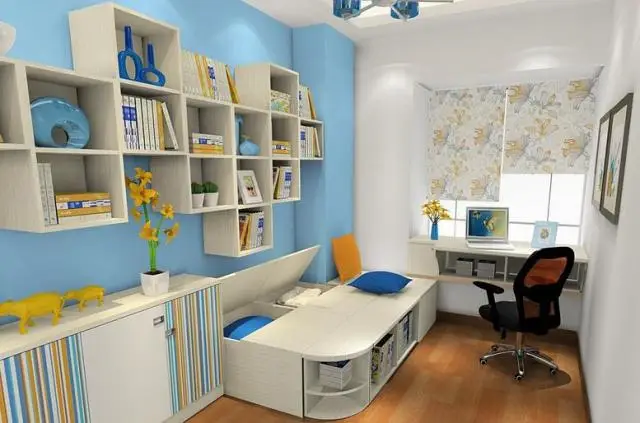 书房面积小,榻榻米和书桌看似不可兼得,可事实上利用好飘窗就能解决问题。飘窗区域直接设计成书桌,节省了空间,光线还能得到保障。至于书柜可以“飘”上墙,你还怕没地方做榻榻米?