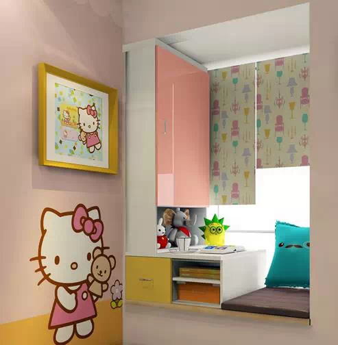 把床放在飘窗旁,飘窗上的组合柜可以放书和玩具。到了睡觉的时候,带着宝贝坐到床边,挑一本童话书,讲个有趣的故事让TA带着美梦入眠。