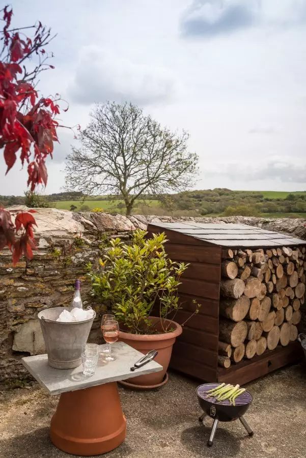 院子里有为客人准备的木柴和BBQ,花盆倒过来和一块石板结合就是一个室外的小桌。
