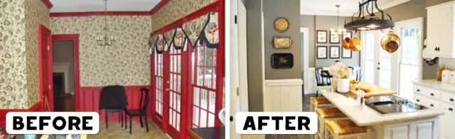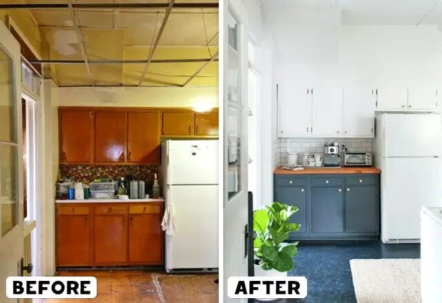 厨房的整体结构几乎没变,但看起来完全不一样了。墙壁翻新一遍,家具上漆,地板换成仿大理石纹理的瓷砖。此外,改造后的室内绿植也是一大亮点,给厨房增添了几分生机。