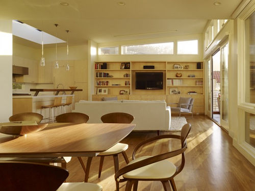 就连餐厅与客厅之间也是没有隔断的。简单的木桌就是整个餐厅的全部。这样的构造,利用墙壁作为自然过渡,让整个房间的功能区各自划分,却又紧密的联系在了一起。
