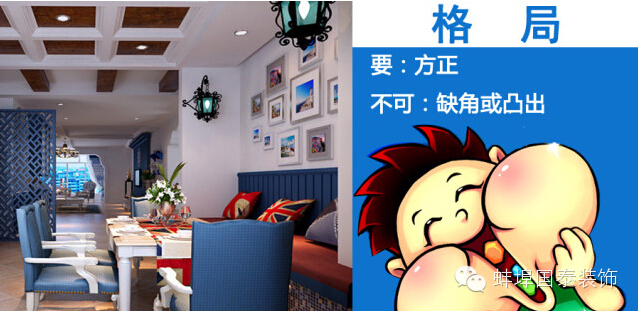 餐厅和其他房间一样,格局要方正,不可有缺角或凸出的角落。长方形或正方形的格局最佳。餐桌不可正对大门,若真的无法避免,可利用屏风挡住,以免视觉过于通透;餐厅天花板不宜有梁柱,若建筑物的结构无法变动,则可在梁柱下悬葫芦等饰物,避免它直接压到餐桌。