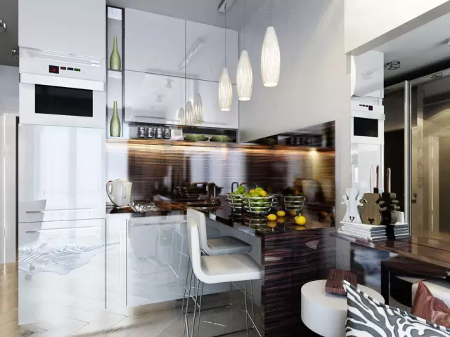 小小的厨房更是戏剧性,采用嵌入式结构隐藏家电,高光泽的橱柜反射大量的光到客厅。