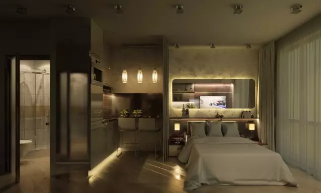 镜子拉伸了空间,而光滑的材料最大限度的扩大视觉感。一面落地窗更是让室内通透、明亮。