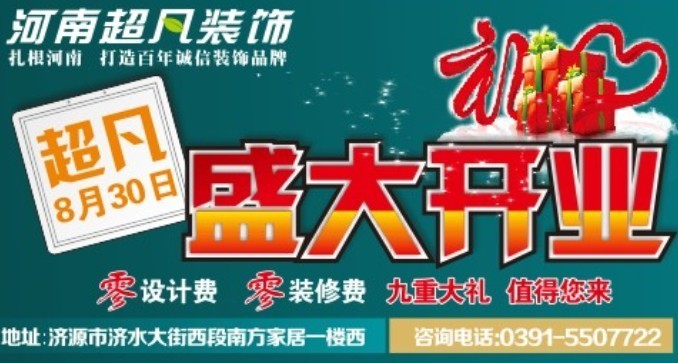 现如今“扎根河南,打造百年诚信装饰品牌”的超凡理念已经深入人心。立秋已至,济源超凡装饰经过三个月兢兢业业,勤勤恳恳的播撒诚意,决定于2014年8月30日盛大开业。