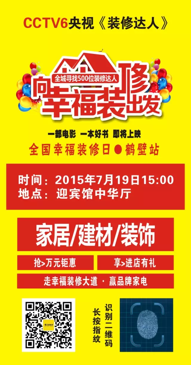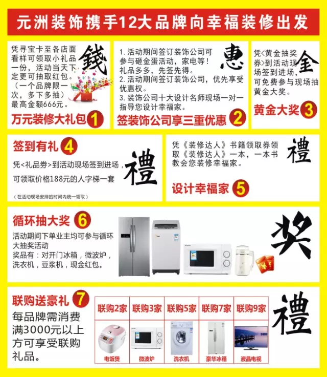 本年度鹤壁最大的家装盛会《向幸福装修出发——全城寻找500位装修达人》由元洲装饰携手12大品牌,共同举办家装盛会,学装修知识、选一线产品、享实惠价格!尊享一站式省心服务!2015年7月19日下午3:00活动开始,抽奖不断、惊喜不断!本次活动品牌与服务接受广大业主监督!