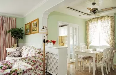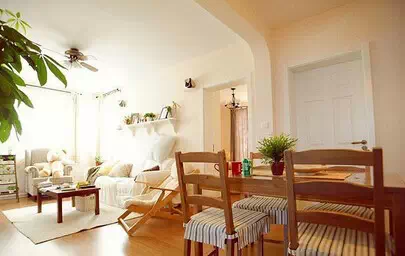 【装饰柜隔断】沙发背景墙不能完全将沙发融进,所以就在旁边设计了一个小柜子,柜面上摆一点田园风格的装饰花,既契合了田园风格主题也起到了装饰作用,还让客厅餐厅空间分明。