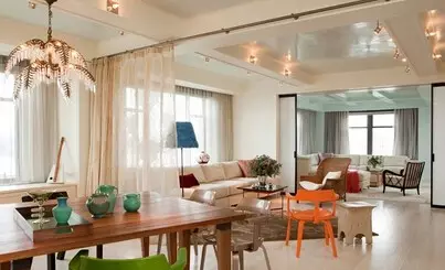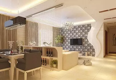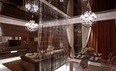 【珠帘隔断】如果想起到空间的通透作用,可以用珠帘来隔断客厅和餐厅,银灰色的材质在吊灯的照射下熠熠生辉,前卫时尚。