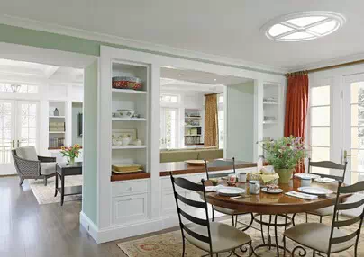 【收纳柜隔断】用收纳柜把客厅和餐厅分割开来,但是又不是完全地隔断,收纳柜还能同时起到两个空间储物的作用。