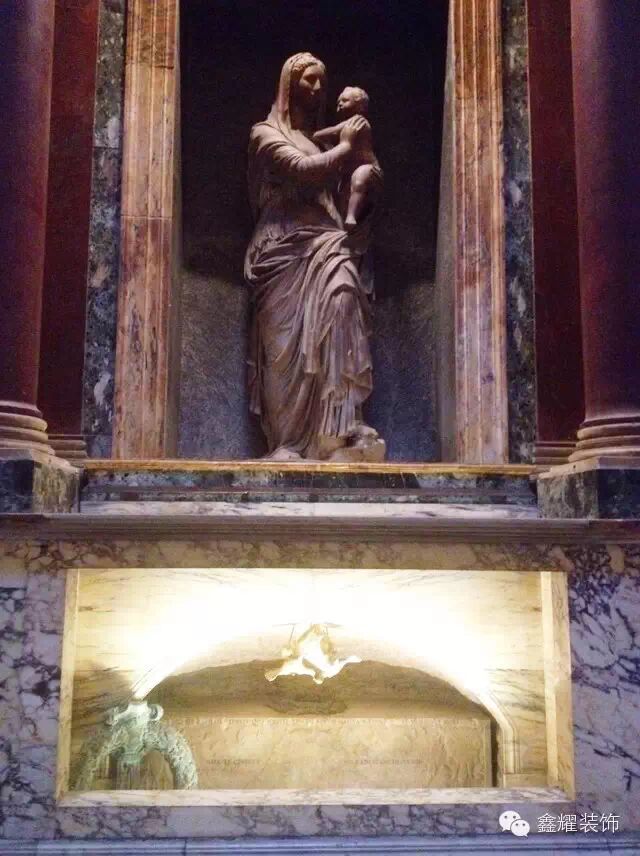 万神庙里最让人难忘的就是拉斐尔的棺墓。它与那个时期其它显贵的棺墓完全不同,没有厚重的石棺和守护神的雕像。仅仅有一个金属的花圈和两只金属的倒挂的小鸟,显得是那样的轻灵和脆弱,正象征着他炫烂而短暂的一生。