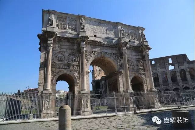 斗兽场边上的君士坦丁凯旋门,是“古罗马”中保存得最好的一座凯旋门。凯旋门上方的浮雕板是当时从罗马其它建筑上直接取来的,主要内容为历代皇帝的生平业绩,如安东尼、哈德连等,下面则是君士坦丁大帝的战斗场景。