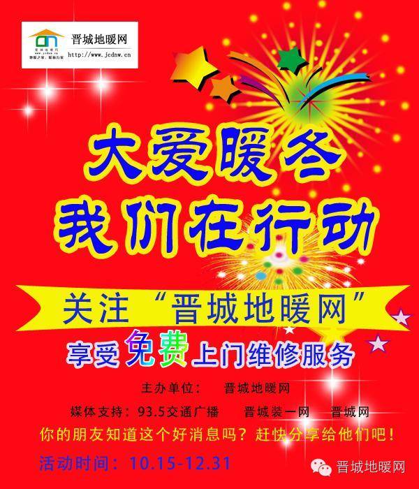 还在担心家里暖气或者地暖不热没人维修吗?还在为当初随便找的施工队现在没有售后保障而头疼吗?10月15日,晋城地暖网携手晋城交通广播93.5,晋城装修第一网举办的首届“大爱暖冬-我们在行动”大型冬季供暖维修活动正式启动,即日起关注“晋城地暖网”公众号即可获得免费上门维修服务。更多优惠等您来拿,让我们全城恋热!!!咨询热线:0356-6963577 这个冬天我们陪您,以后的每个冬天我们都陪您。