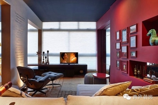 桃红色的背景墙鲜艳夺目,大大增加了客厅的活力;挖空部分可成为收纳区,其镜面也有效地扩大了空间感;多种照片和壁画装点的背景墙充满艺术气息,成为了客厅的最大亮点。