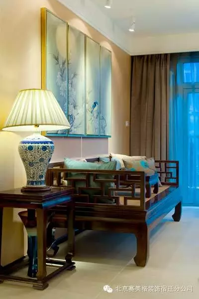 新中式的居室内色彩不易用较多,其色彩讲究对比及稳重感,如中国红和中国蓝。像苏州园林和京城民宅内饰为木色为基调,在此基础上以皇家宫殿的红、黄、蓝、绿等作为局部点缀。