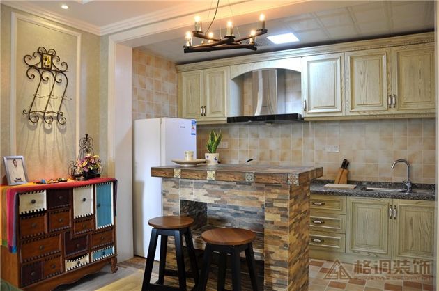 不管空间大小,只要巧妙利用,都可美观实用。设计师赵丹将复古吧台与厨房紧密相连,形成一个开放式的烹饪就餐空间,营造出温馨的就餐环境,让“开放式厨房”自然地融入到整体家居氛围内。