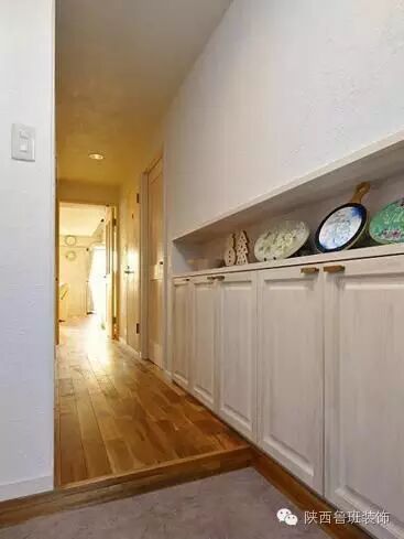 白色的收纳柜,放置家中的大件杂物,实用至极。木质的手工装饰品,精美别致,引人眼球。玄关处的淡紫色地板,让这里顿时拥有了优雅好客的气氛。