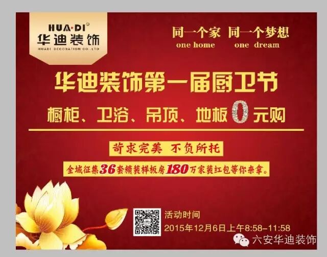 12月6日华迪装饰特别推出“第一届家装厨卫节”活动,38家一线品牌建材现场让利,以成本价出售优质的建材;全城征集36套精装样板房,180万家装红包等您来拿,让更多物美价廉的商品进入您家,让您持家有道。