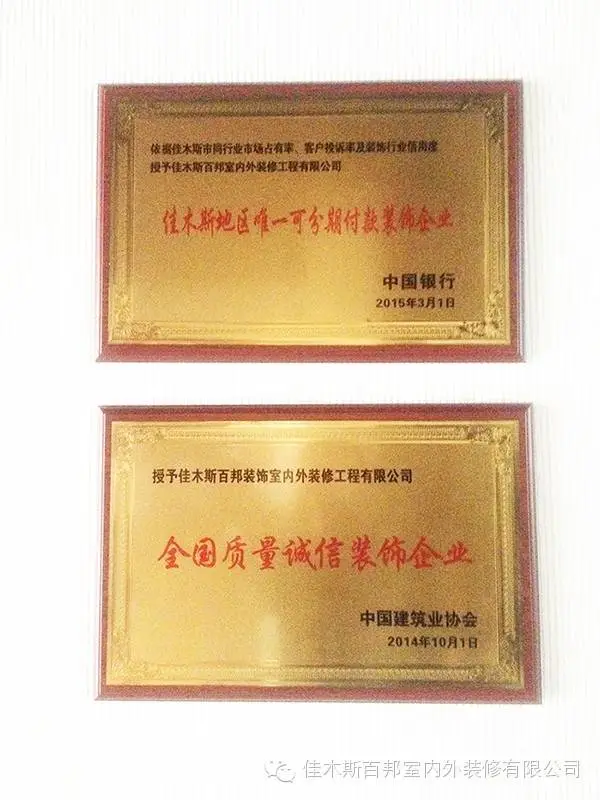 中国建筑业协会和中国银行结合在佳木斯地区百邦装饰的市场占有率、施工质、客户满意度,分别于2014年10月1日和2015年3月1日正式向百邦装饰颁发相应证书。