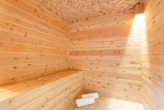 除了流水花木之外,中庭里还设有干蒸房和带火炉的休闲区,木板地与石板路相接,美得像秋天里的花房,让人一见倾心。