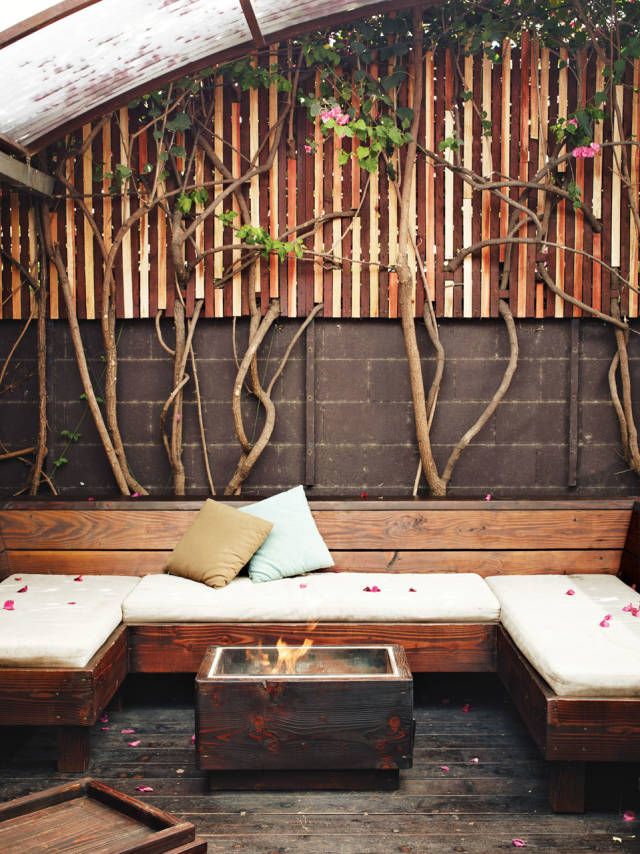 处处可见日式风情,尤其,是在日光倾泻时,带有唯美的透光顶棚的庭院。与室内的设计一样,院子里也採用了大量木材来构造,既温馨自然又显格调。