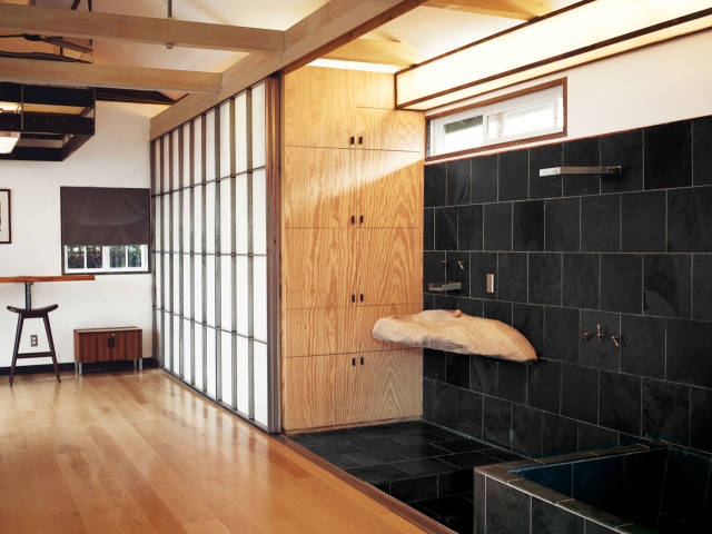 日式的推拉门,延伸至浴室,与黑色的大理石墙壁一起,营造而出带有东方气质的古典韵味。