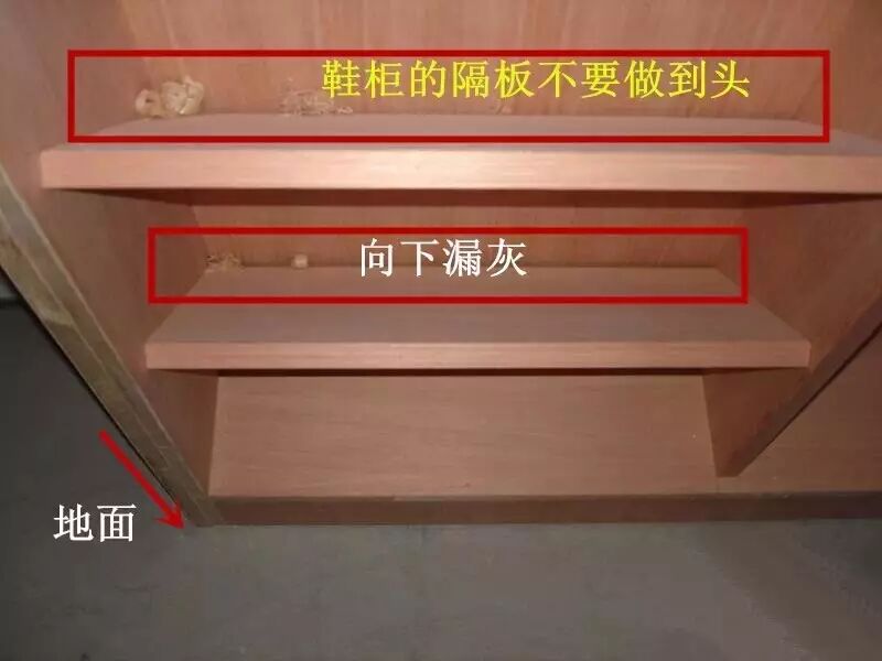 12、鞋柜的隔板不要做到头,留一点空间好让鞋子的灰能漏到最底层,水槽和燃气灶上方装灯。定卫生间地漏的位置时一定要先想好,量好尺寸。地漏最好位于砖的一边,如果在砖的中间位置的话,无论砖怎么样倾斜,地漏都不会是最低点。
