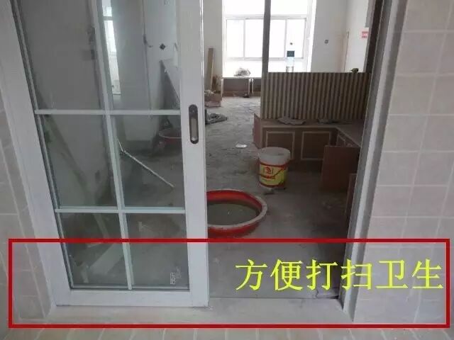 16、塑钢门的时候一定要算好塑钢门门框凸出墙壁的尺寸,知会安装人员,使得最后门框和贴完瓷片的墙壁是平的,这样既美观,又好做卫生。
