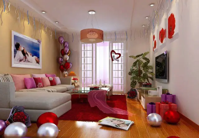 气球、玫瑰花和婚纱照成为婚房客厅装饰的主力军,看起来既喜庆又温馨。