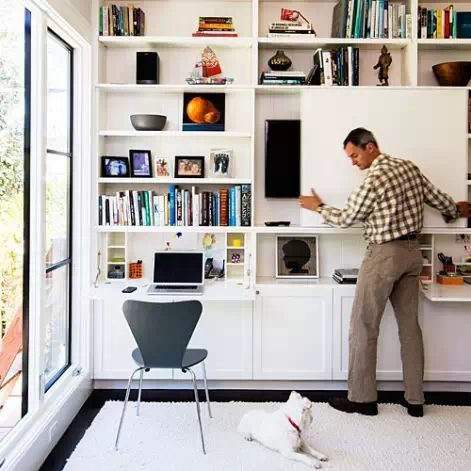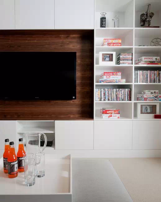 如果你家不大,那就可以让电视背景墙兼具收纳功能,这也是最多数人的需求。