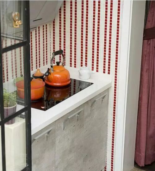 改造后——厨房中餐料理:为充分利用空间,设计师将中餐料理安置在入户的小过道,被设计成半开放式。混凝土质感表面的橱柜又耐脏、又雅致,如同一张朴实的画纸,跃动的亮色厨具和镶拼马赛克墙面、地面就是彩笔,共同描绘出精致的生活画卷。