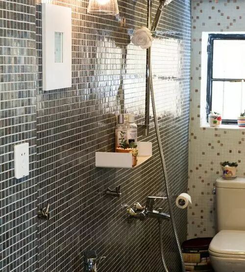 改造后——卫浴区:其实这个客卫是一个长达5米进深的异形空间。台盆、灯具、储物隔板都是超级迷你尺寸,采购难度颇高,但完工后看起来非常自然。