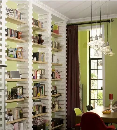 改造后——餐厨多功能区:书架是红砖刷白,木隔板可以随意抽插,因此展示和收纳变得自由自在。