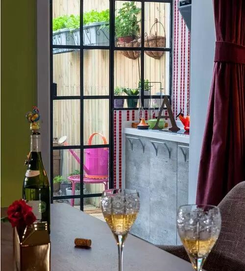 改造前——餐厨多功能区2:从装修后韵味十足的餐桌位置向外望去,原先这一堵再普通不过的院墙钉上防腐木板材,挂上花架,便成为怡情悦意的景观。