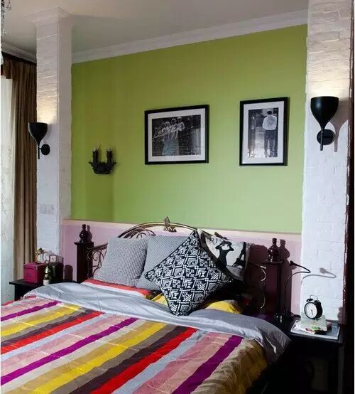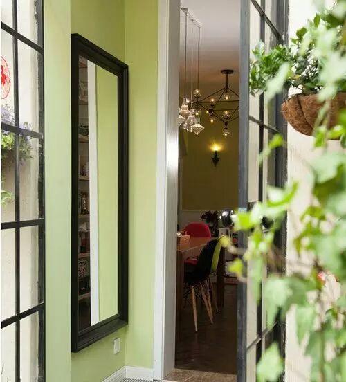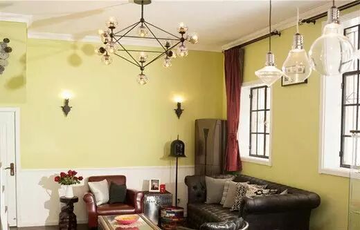 多功能区的墙面色运用了非常透气的淡苹果绿,进一步放大视觉延伸度,窗帘则选了极富垂坠感的绒质,暗红绒质窗帘与复古深色实木地板、实木简约款餐桌之间有呼应,而餐椅和吊灯却极具现代感。
