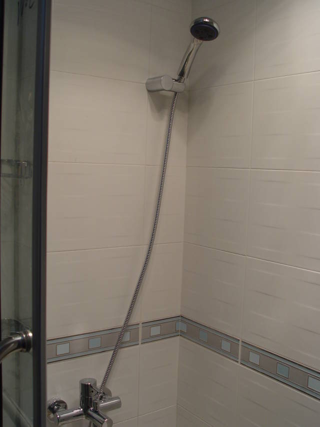 排水管时工人竟将管子从上往下走,结果事后安装花洒支架时便不敢随意打洞了,以此只能把支架装在墙角。倾斜的管子,影响了卫浴间的美观。