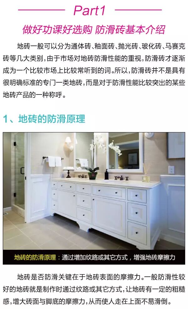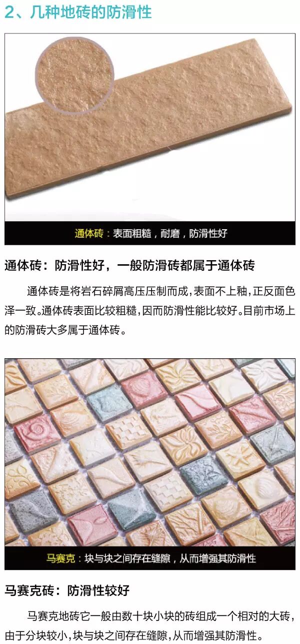 在家居装修的时候,从选材到施工都需要非常细心。常常一个很小的改善,会让生活变得舒心、安全得多。就像地面选择铺砖的家庭,特别是厨卫空间地面,如果选择的是防滑砖,将大大减少家人滑倒摔伤的几率。那下面就随着编辑一起来看看,如何选购到优质的防滑砖吧。