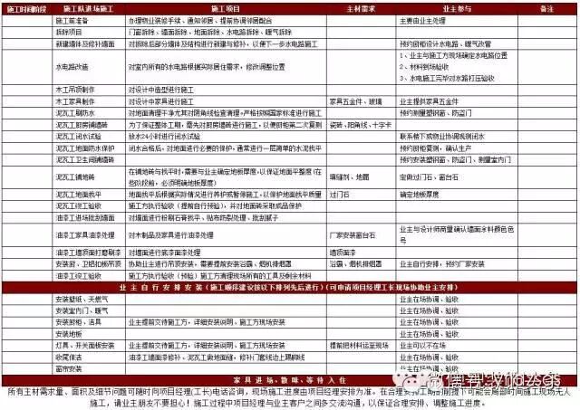第一周:认识装修【主要是了解装修材料及装修公司情况】第二周:设计阶段、装修预算规划、材料选购第三周:开工准备、拆除工程、材料定购第四周:新建墙体、水电改造、暖气改造、材料定购第五周:瓦工铺砖、厨卫防水、木工制作、测量厨柜(复测)、测量门窗第六周:地面找平、地面铺砖、安装室外窗、安装防盗门、油工进场第七周:墙顶面粉刷、安装厨房、卫生间整体吊顶第八周:墙顶面刷漆、安装墙面壁纸、地面地板、室内门、灯具、洁具等各项安装工程第九周:收尾、保洁、进家具、开始散味净化空气,准备入住新居