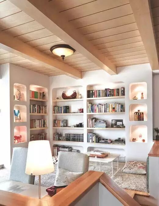 榻榻米和书柜的拼接设计,刚好利用书房的多余空间,看书累了就躺在上面放松放松,下面的格子还能用作储藏柜,实用又温馨。