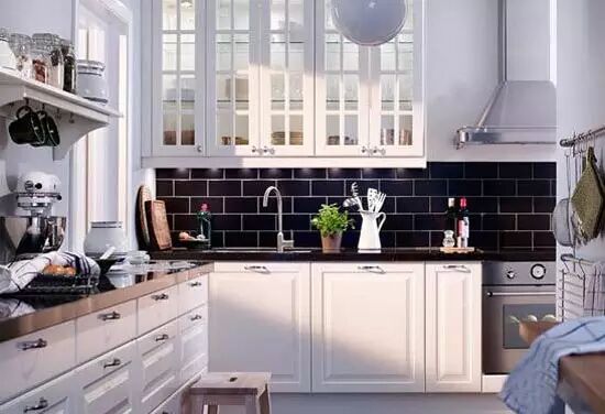 光线:室内装修非常注重光线,厨房装修也一样。小厨房本来面积就小,如果光线什么的没有把握好,会让整体显得更为拥挤闭塞,煮食就会不愉快,那最后的食物也不会那么好吃了。对于中餐来说,色泽更为重要了。厨房光线不够充足的话,务必安装一盏瓦数足够的灯,让光线充足。且灯光最好是白色的,不要影响烹饪者对于色泽的判断,从而影响食物的火候。要注意的是,尽可能不使用射灯,避免灯光有阴影产生。