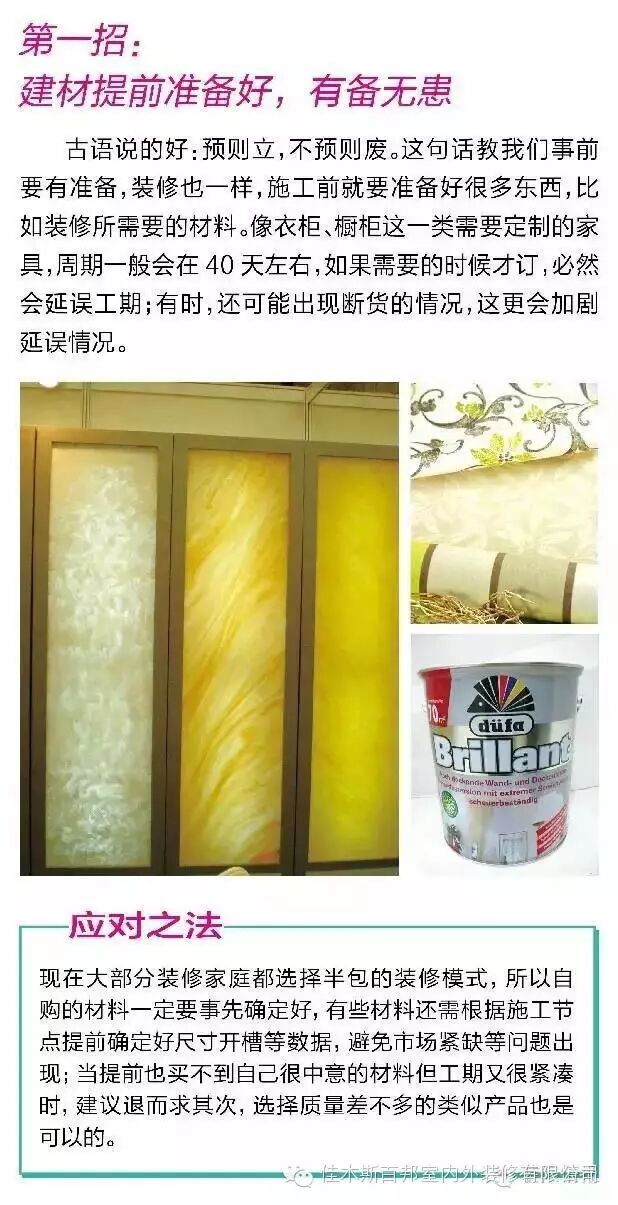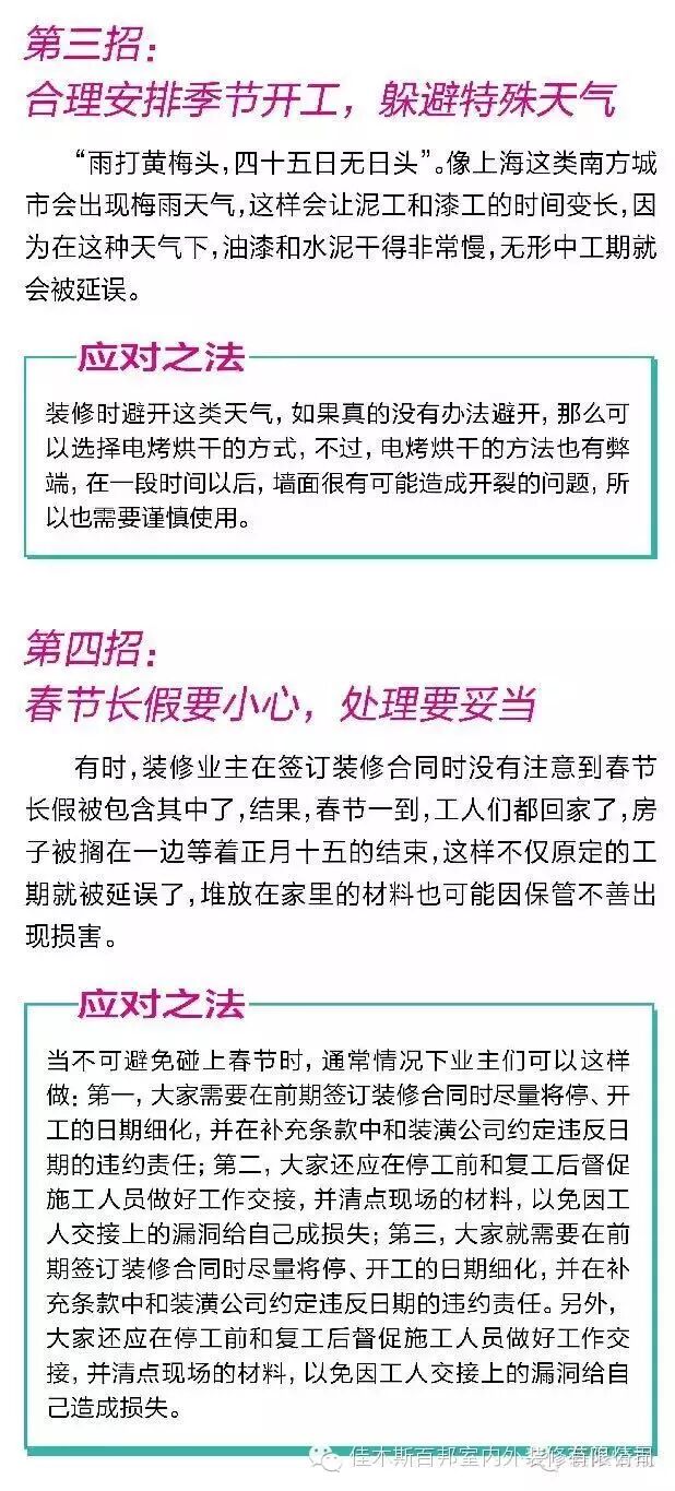 虽说装修的施工质量和预算超支是大家普遍关心的问题,然而工期拖延的情况有时也让人心塞,特别是那些掐着时间点装修婚房的、房租到期急着搬家的家庭,遇到工期被拖延就更容易忙中添乱了。为了避免这一恼人的问题,百邦特意收集了一些资料供大家参考,希望能把这类问题从源头上清除。