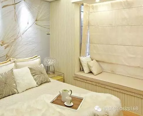 一款很典型的新户型大窗台,简单改造成了舒适的沙发,案例中,搭配十分重视整体感,飘窗沙发的设计完全参照卧床,不仅用了米白色系的沙发垫和靠枕,在窗帘的设计上也和卧室床头的墙贴相互辉映。