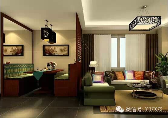 设计要点:可以选择在餐厅的外侧塑造小柜体,将大格局巧妙地分割开来,紧贴电视柜上设置一面珠帘,不但善用电视柜空间而且让整个空间有种宽敞感。